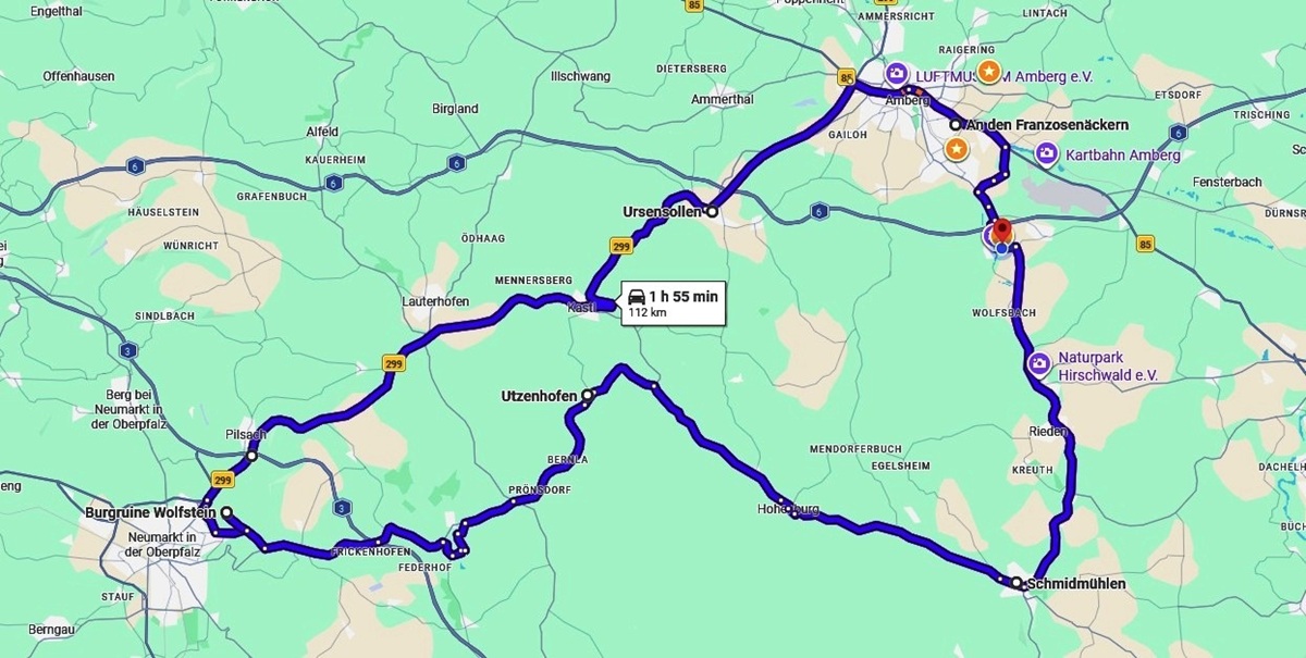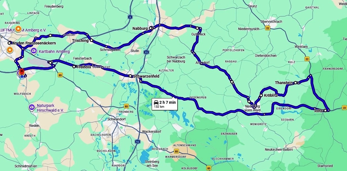 Nachdem ich am Montag den Spritpreisschock verdaut und die GS aufgetankt hatte, machte ich mich auf den Weg zu meinem Lieblingsplatz im Obermurnthal, nahe Neunburg vorm Wald und fuhr dann noch eine kleine Runde, wie auf der Karte zu sehen ist.